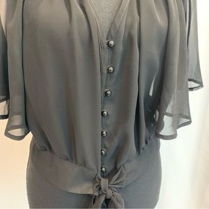 FOREVER 21 black lace chiffon short bell sleeve button front tie waist blouse L