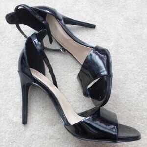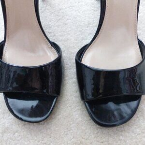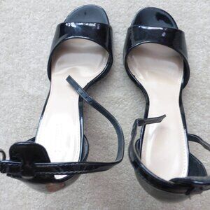 In very good condition! Only worn a couple times - they are a size 6.5 and a bit big for me (I am a true to size 6) Very simple, classic black patent heeled sandals, adjustable buckle straps. Great pair of heels for your next night out, event or party!