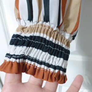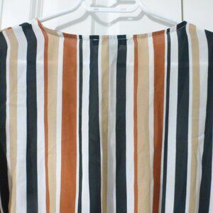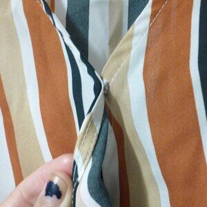 In very good condition! Earth tone stripes consisting of white, green, orange and yellow! Stretchy elastic at the waist and ends of the sleeves. Cropped, v-neck.