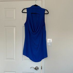 Loose fit blue flowy top with a cool cut out detail in the back. Nicely draped and flattering. Slightly sheer. Great with a pair of jeans.