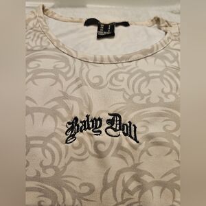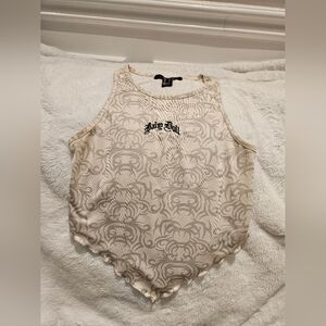 Stylish tank top with intricate gray patterns. Features a unique hemline for a trendy look.