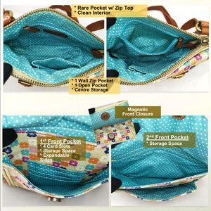 FOSSIL Beige Brown Messenger Bag made with Multi-color Floral Canvas Crossbody Shoulder Purse Handbag, Zip Top, Flap Front Pockets with Magnetic closure. Adjustable Shoulder Strap. It is a Functional Medium size bag. Gently used in mint condition.