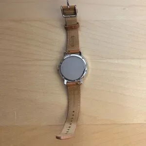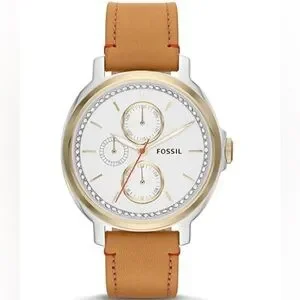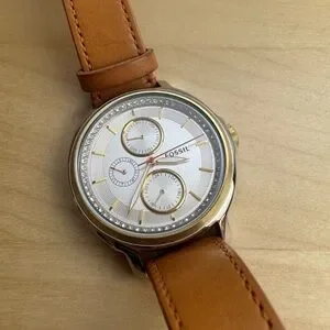 Beautiful Fossil watch with tan leather band. Gold accents with crystal-lined rim. Was never a daily-use watch so in excellent condition. Always stored with care in a watch box. One small stain on leather band, barely noticeable.