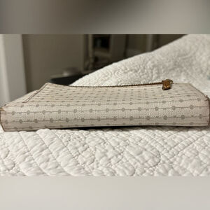 Elegant cream wallet with brown accents. Features a zippered pocket for convenience.