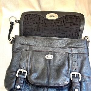 😍🌻 FOSSIL Leather Messenger Crossbody Bag Black Turn Lock Lined
