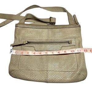 In good pre owned condition showing some minor wear and interior soiling. 1 outside zip pocket; 2 interior slip pockets and 1 zip pocket. Adjustable canvas backed leather strap can as long as 29”. Photos are important so please check all for condition, detail and measurements.