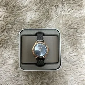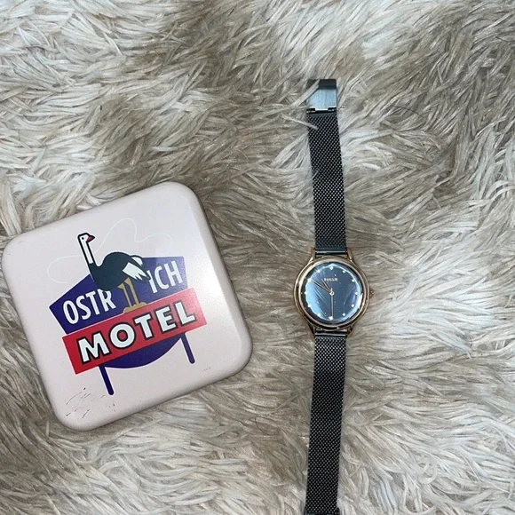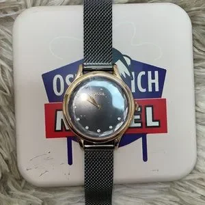 Gold and black fossil watch. Never used. Plastic is still on face. Few scratches on the box that’s it.