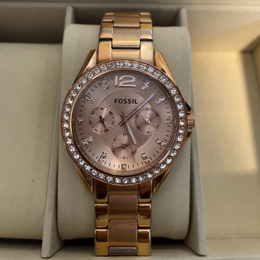 Riley Multifunction Rose-Tone Stainless Steel Watch. No scratches to watch face or rhinestones, fully functioning.