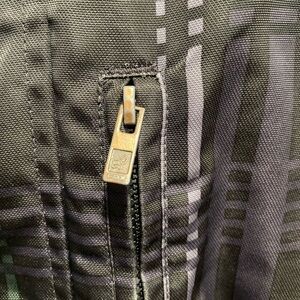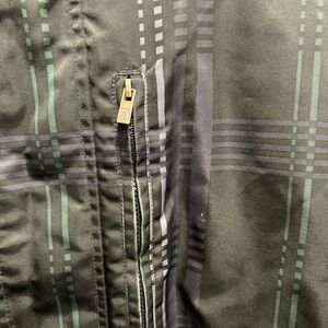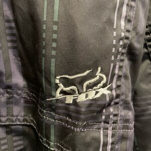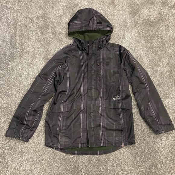 FOX racing men’s jacket. 2 way Zipper with Velcro closing. Two front hand pockets, one chest pocket, hood with adjustable pull tabs. Velcro adjustable cuffs. Green fleece inside. Not a lightweight jacket but not for super cold either. In fair/good condition. A few tiny white marks as seen in photo and could use a better deep washing. Mens size medium or fits as a women’s XL.