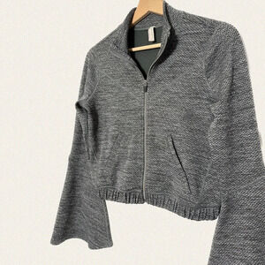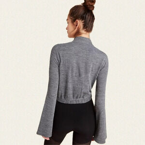 textured design with a mock neckline and flared bell sleeves,