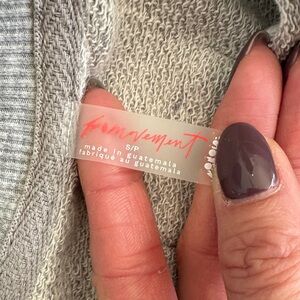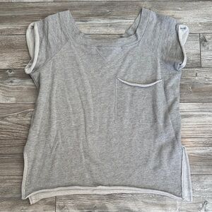 Elevate your casual wardrobe with this stylish gray top. Perfect for everyday wear, it features a comfortable fit and a chic design. Falls off the shoulder if you want, flattering bottom side slits. Embroidered logo on the back. Size small tagged, fits medium also. This is like a sweatshirt tee. 93% cotton, 7% polyester.