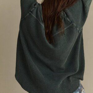 Features: Soft cotton fabrication, thermal design, wide scoop-neckline, drop-shoulder sleeves, high-low hem