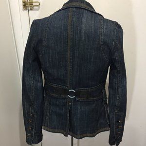 Fracomina Denim Jacket, Size M, Color Dark Indigo, Brown Thread Stitching, 98% Cotton, 2% Spandex, Lining, Front Flap Button Pockets, Back Small Straps, Center Keyhole Metal, Back Split, Cuffs Buttons, inside Small Buttons, Closure Hooks, in Good Condition, Thick Denim Jacket, Great Look, Great Fitting.