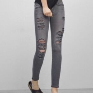 The Le Skinny de Jeanne style jeans from Frame are low-rise, stretch skinny jeans. This pair is in the shade Grey Shred, a faded grey featuring general distressing and rips. They are in good used condition with gentle wear.