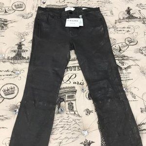 FRAME's cult-favorite skinnies are reimagined in supple, stretch-lambskin leather that hugs curves before easing into split hems.