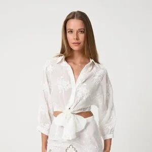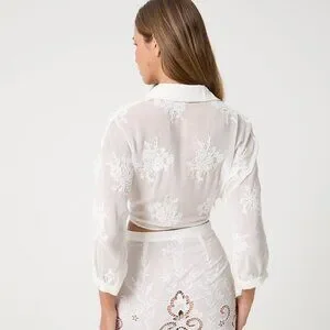 The Frances Top is a sheer embroidered blouse featuring a front tie closure and soft collared neckline. Designed for an effortless, romantic look.