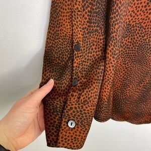 In great condition. Satin soft finish. Abstract animal print. Pointy collar. Beautiful rust color. Measure lay flat: shoulder 16'' bust 20,5'' length 27'' sleeve length 25''.