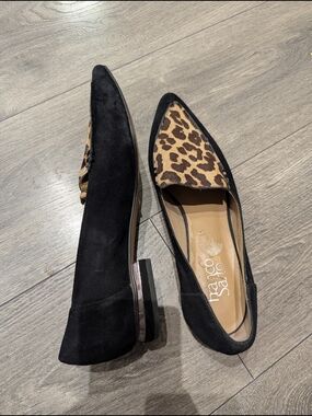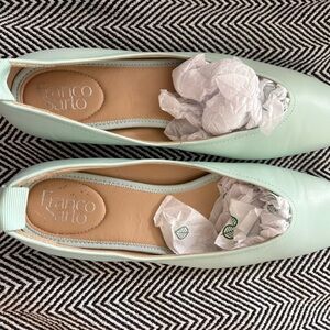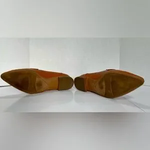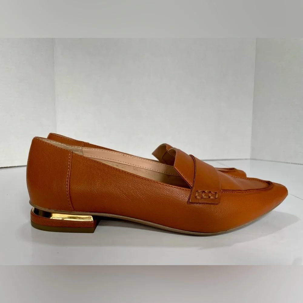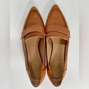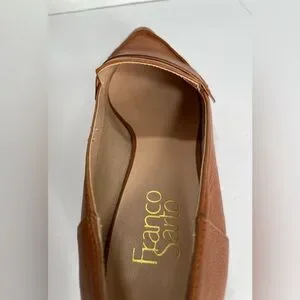 Chic Franco Sarto pointed toe leather flats in a rich warm brown tone. These elegant loafers feature a sleek silhouette with a refined pointed toe and a subtle gold metallic heel accent that adds a polished designer touch.