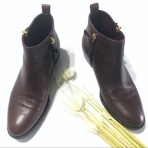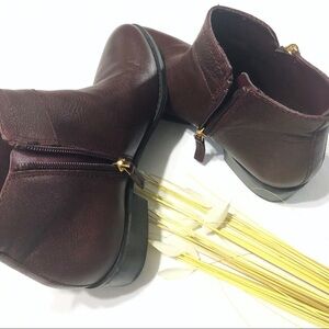 Beautiful Italian ankle bootie in a classic design • NWOB • Deep Chestnut Bordeaux colour • Feature 2 angled gold coloured zippers: inside is functional; outside is decorative • Tassel embellishments on zippers • Almond toe • Pull tabs • Pebbled Genuine Leather uppers • Manmade balance (sole/insole)