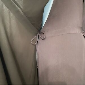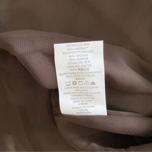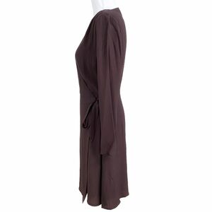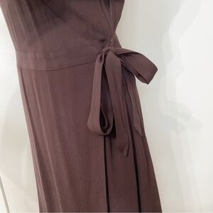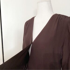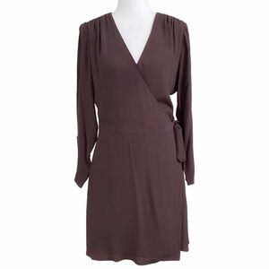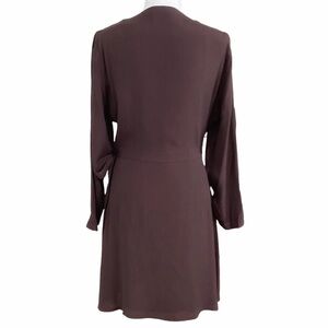 FRANK AND OAK THE WRAP BELTED MINI DRESS IN CHOCOLATE SHIMMER BROWN, As described on Frank and Oak website : Embrace the season with elegance and comfort. Made from a soft and flowy blend of LENZING™ ECOVERO™ viscose, an eco-friendly fibre derived from sustainable wood and pulp, this wrap dress features a regular fit and a V-neck collar. Above knee length. Long sleeves. Wrap closure with a side tie. Shirring at the front of the shoulders. Wash cold delicate cycle - Do not bleach - Iron low heat - Hang to dry - Do not tumble dry - perfect casual to formal yet slightly underdress neutral versatile classic wrap dress for any seasons with stocking or heels - loafers or flats for a business casual look. Minimalist, comfy - flowy.