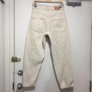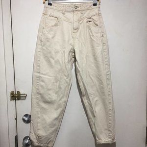 Frank & Oak High Rise Ankle Jeans, Lightweight Size 27, Color Cream, 65% Organic Cotton, 35% Hemp, Side Pockets, Back Pockets, Closure Zipper, Button, Good Condition, Great Balloon Jeans, Great Look, Great Fitting.