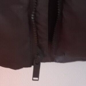 Dark navy blue puffer jacket that has an integrated pouch you can stuff the jacket into