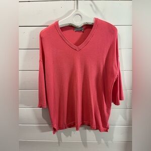 Elegant knit V-neck top in a vibrant coral pink. Relaxed fit with 3/4 sleeves and soft ribbed details at cuffs and hem. Perfect for layering or wearing solo for a casual-chic look.