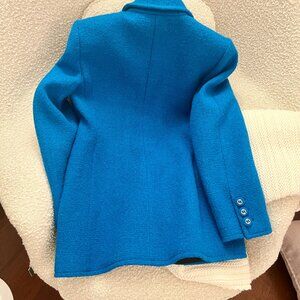 Gucci Blue/Turquoise 2025 Wool GG Button Coat. Textured wool collared coat/ blazer with three pocket design and tapered waist. Silver interlocking GG logo button closure and at cuffs. 94% Wool, 6% Polyamide. Marked size IT 42 or US 6.