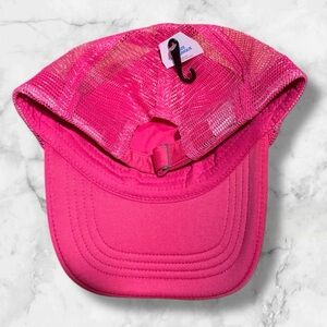 Bright pink cap with 'LOVE' embroidery. Features colorful stitching.