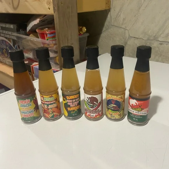 Set of six assorted hot sauces. Vibrant labels with unique designs. Perfect for spice lovers.