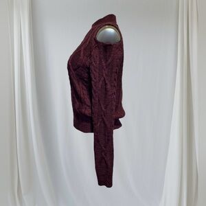This cozy burgundy mock neck sweater from Ardene is crafted from a thick textured knit fabric featuring an intricate cable knit pattern that adds warmth and visual interest. The long sleeves and subtle cut out at the shoulders enhance its stylish appeal.