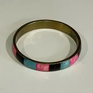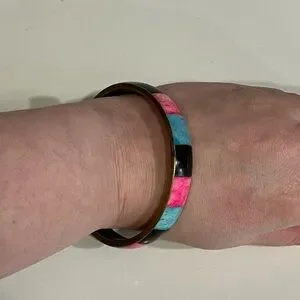 Elegant bangle bracelet featuring vibrant pink, blue, and black stone inlays. Perfect for adding a pop of color to any outfit.