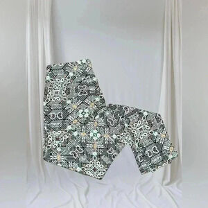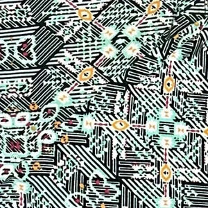 Light green, blue, burgundy, gold, black and white colours. Polyester/Spandex blend fabric