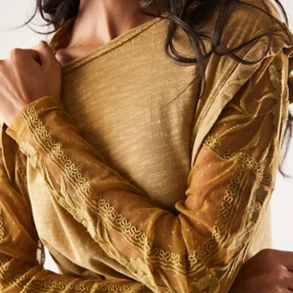 Fabulous Tee with sleeve insets in lace. Nice smooth T Shirt material and the insets are done at the top of the arm with a small 1" cap, making the look more sophisticated. All edges are sewn and then the fold is cut. This is a lovely olive green so great for a coordinated effort with jeans and skirts. Can go to town in this one. XS - P to P 21". I didn't find an opportunity to wear this for some reason so it is NWOT. This item is on the Free People site for $122.00