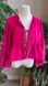 Features: Soft velvet fabrication, V-neckline with collar detail, functional ties down center-front, balloon-inspired sleeves, defined seam with ruffle detailing