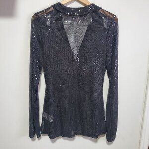 FREE PEOPLE Sequin Shirtee Button Up Blouse Top Ruched Sheer Black Women's Large