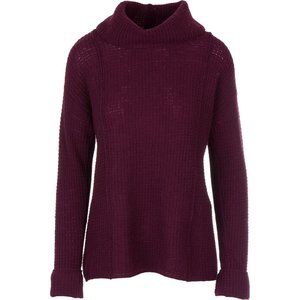 Knit cowl neck wool Sidewinder sweater by Free People. A gorgeous waffle knit pattern with ribbing throughout in a beautiful magenta colour. This is the perfect cozy sweater for a cooler day! Looks great tucked into a pair of high waisted jeans, worn with a simple midi skirt, or dressed up with a pair of pleated trousers