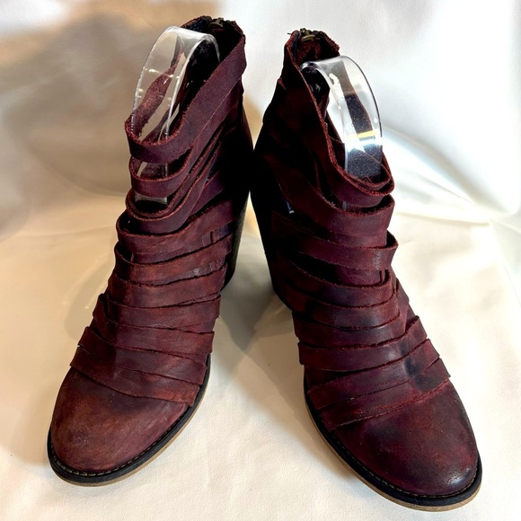 FREE PEOPLE Sz 8.5 (estimated) Burgundy Strappy Leather Ankle Boots Stacked Heel