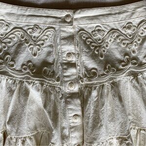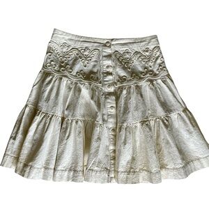 Gorgeous cream mini skirt with cute button-front. Features unique embroidery and tiered design.