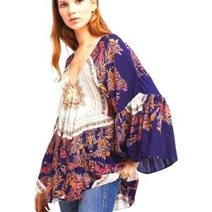FREE People Sunset Dreams Blue Boho Tunic Bell Sleeve Flowy V-neck top Size XS