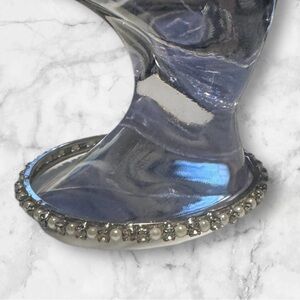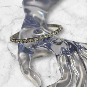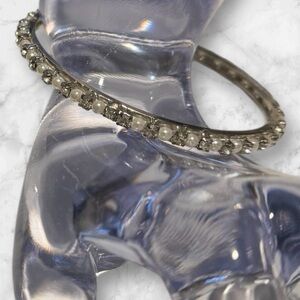 This vintage silver tone bracelet showcases a smooth polished surface and is embellished with small faux pearls and clear stones that are evenly spaced around its circular design. Its combination design adds a touch of elegance, making it a perfect accessory for any occasion. 8” in diameter.