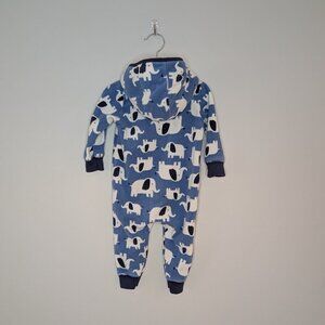 ✂️ Fit & Features: Fleece zip up one piece romper with sherpa lined hood and blue elephant pattern.