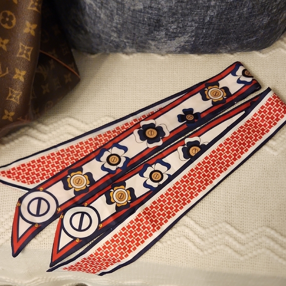 Stylish scarf with a red and white floral pattern. Perfect for adding a pop of color to any outfit.