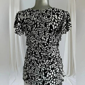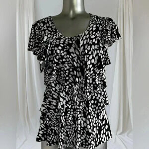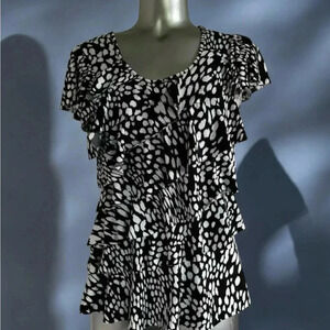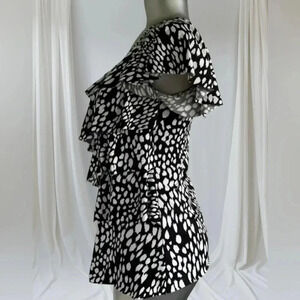 Black and white animal print, diagonal front ruffles and sleeves. Polyester/Spandex fabric.