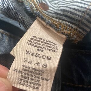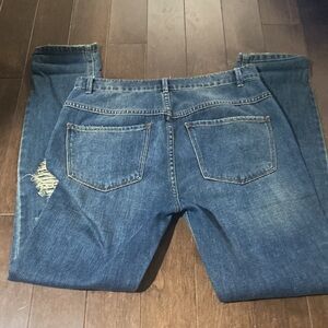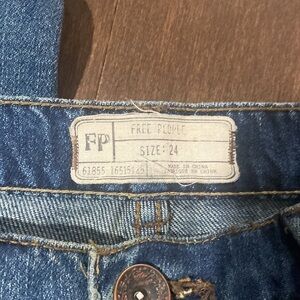Free people size 24 distressed high rise skinny jeans with button fly. Tapered leg. Not stretchy, lower rise.