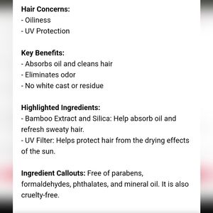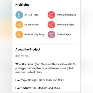 "What Else You Need to Know: This quick-drying, dual-phase liquid mist is formulated to refresh strands with no white cast or residue. Plus, it absorbs oils and helps eliminate odor with a fragrance of clementine, wild hyacinth, and sheer sandalwood. Sweat fearlessly. Clean instantly. This multitasking mist? It was made for speed.