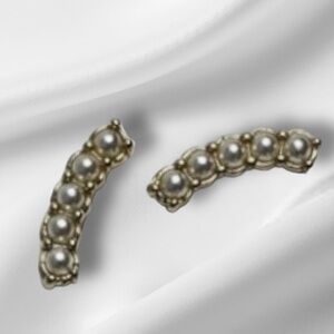 Elegant earrings with gold-tone setting. Features silver pearls. Perfect for any occasion.