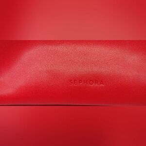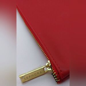 The Sephora Red Cosmetic Bag is a chic and functional accessory, perfect for storing your beauty essentials. Crafted from a smooth, leather-like material, it features a striking red hue complemented by a gold zipper closure. Its structured, trapezoidal shape ensures it stands upright, making it both stylish and practical for everyday use.