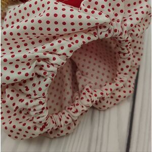 Handmade charming vintage grandma dolls. One wears a red and white polka dot dress, the other in cream with floral accents.