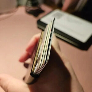 It holds up to 5 cards with a piece of cartboard that I pointed out in picture, because the sixth card is getting stuck in it and I had to use a tweezer to take it out. So, I will leave you the cardboard I cut and put in it. You will be able to take it out with tweezer and change it for a card you don't use anymore